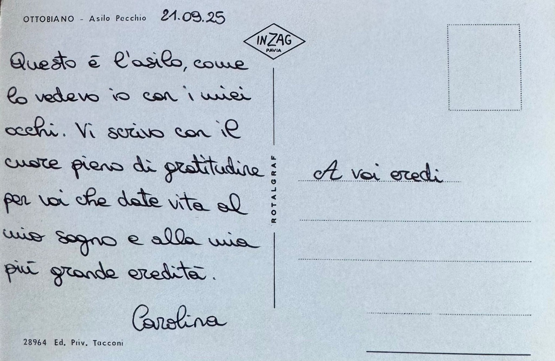 L'Asilo Infantile Pecchio porta il nome e l'anima della sua fondatrice, Carolina Pecchio. La sua missione, che guida il nostro agire da oltre un secolo, è rivolta alla salvaguardia della dignità del bambino e al suo diritto di crescere in un ambiente di amore incondizionato. Crediamo fermamente che solo attraverso l'educazione del cuore i bambini possano guadagnare il rispetto di sé e degli altri.